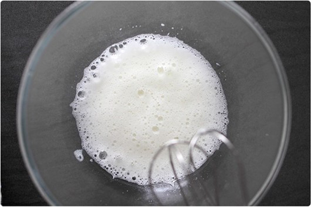 Đối với lòng trắng bạn cho muối vào, dùng máy đánh trứng đánh với tốc độ thấp nhất đến khi xuất hiện bong bóng trắng.